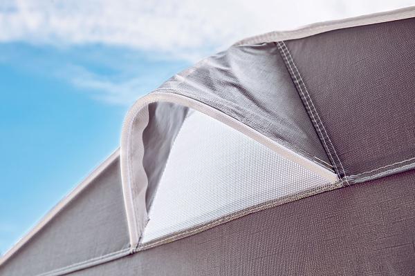 Afin de créer un climat intérieur agréable et garantir que vos affaires ne soient ni humides, ni moisies, Isabella Space est dotée d'une ventilation permanente sur le côté de l'auvent.