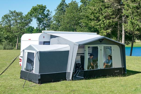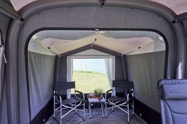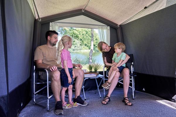 Alle luchtkanalen zijn verbonden in een geavanceerd luchtsysteem, zodat u slechts met één ventiel hoeft op te blazen. De lucht wordt automatisch door de hele aanbouw verdeeld. Beide ventielen hebben een praktisch rubberen membraan dat voorkomt dat er lucht weglekt wanneer u de pomp verwijdert. Er zijn in totaal twee ventielen, die allemaal geopend kunnen worden om de lucht er snel en efficiënt weer uit te laten. Alle ventielen zijn discreet geplaatst achter een beschermende zak die beschermt tegen regen en vuil.