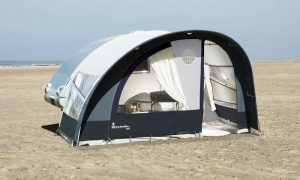 De T@B-voortent is ontworpen om te passen bij de unieke druppelvorm van de T@B-caravan. Met een diepte van 225 cm creëer je een gezellige leefruimte. De voortent heeft ramen aan beide zijden, waardoor een lichte en luchtige omgeving ontstaat. Het raam aan de rechterkant heeft een geïntegreerde klamboe en kan worden geopend door de afdekking op te rollen voor extra ventilatie. De T@B Voortent 400 heeft ook een voorraam met een geïntegreerd muskietennet dat kan worden geopend. Op warme zomerdagen kun je de voorkant van beide modellen volledig uitritsen om een luifel te creëren.
