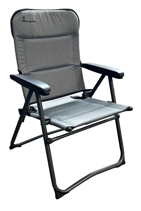 The seat is padded with 1.5 cm of foam and upholstered with durable polyester with a PVC coating, providing great sitting comfort and easy maintenance. The powder-coated aluminium frame (Ø25 mm) makes the chair stable yet easy to handle and fold away. The Nanna chair is available in Light Grey, a colour that suits most camping settings with its simple and modern look.
