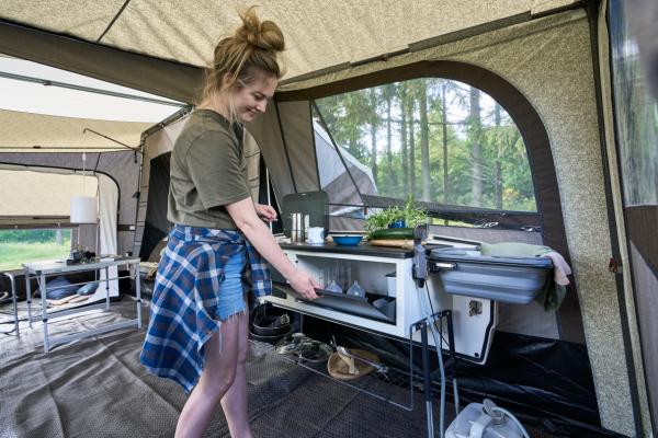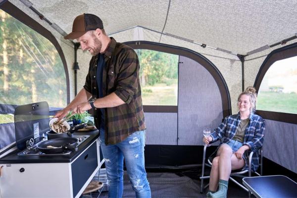 Har du et kjøkken i din Camp-let? Da er dette sideteltet spesielt praktisk. Det fungerer perfekt som et overbygd kjøkken, slik at du kan tilberede måltider uten å bekymre deg for været. Sideteltet kan også brukes som ekstra soveplass, spiseplass eller ekstra oppbevaringsplass.