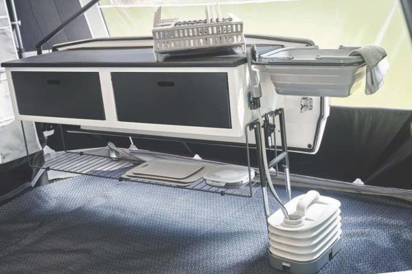 Under benkeplaten finner du to romslige oppbevaringsrom og en hylle som er perfekt for å holde servise og kokekar organisert og lett tilgjengelig. Kjøkkenet har også en sammenleggbar vanntank på 10 liter og en sammenleggbar oppvaskbalje, som begge tar minimalt med plass under transport og oppbevaring. Elektrisk batteridrevet vannpumpe med tappekran og dusjhode med USB-lading sørger for at du har vann til oppvask og dusjing.