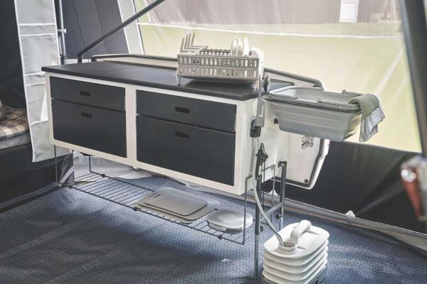 Under benkeplaten finner du to romslige oppbevaringsrom, to funksjonelle uttrekkbare skuffer og en hylle, perfekt for å holde servise og kokekar organisert og lett tilgjengelig. Kjøkkenet har også en sammenleggbar vanntank på 10 liter og en sammenleggbar oppvasksbalje, som begge tar minimalt med plass under transport og oppbevaring. Elektrisk batteridrevet vannpumpe med tappekran og dusjhode med USB-lading sørger for at du har vann til oppvask og dusjing.